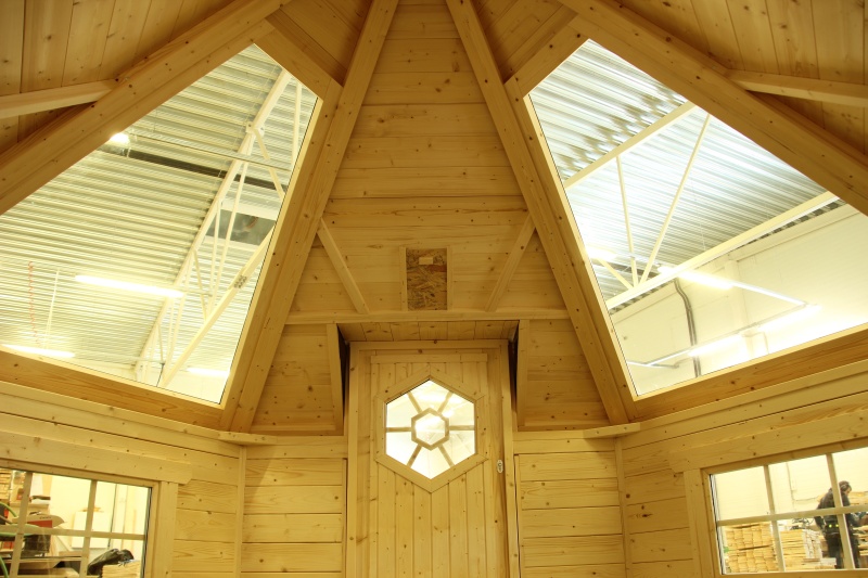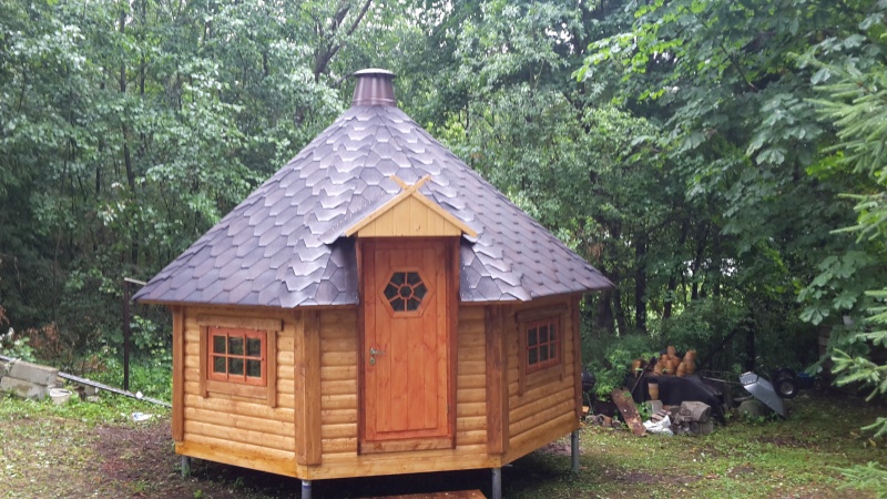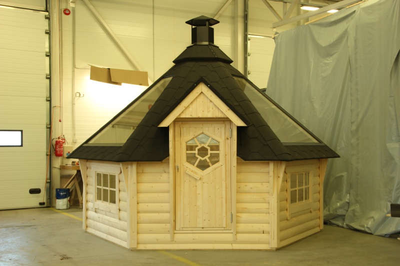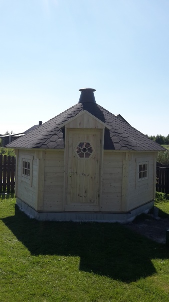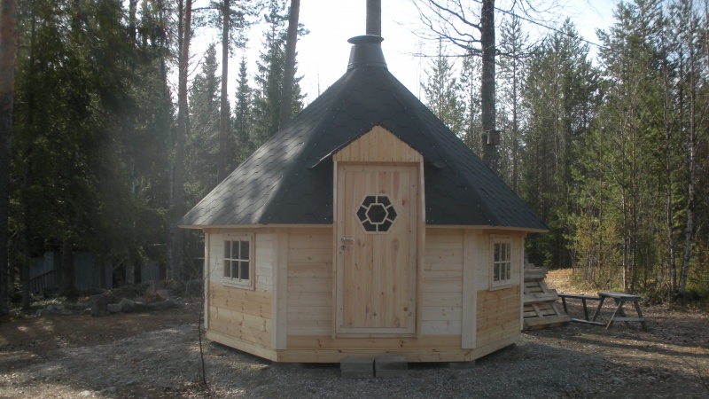 6-kulmainen kota ,valmistettu kuusesta,seinäelementit 44mm alapuu kyllästetty,katto elementit,paketti lasi ikkunat 3kpl jotka avattavat.lukollinen ovi.