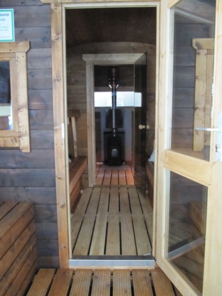 Asiakkaalle jää vain vesisäiliön ja piipun asennus katossa on valmiina läpivienti reikä piipulle.Saunan lattiassa on reikä pesuvesien poistoa varten.Saunan asennus alle suositellaan sepeliä ja saunan jalkojen alle pihalaatat.