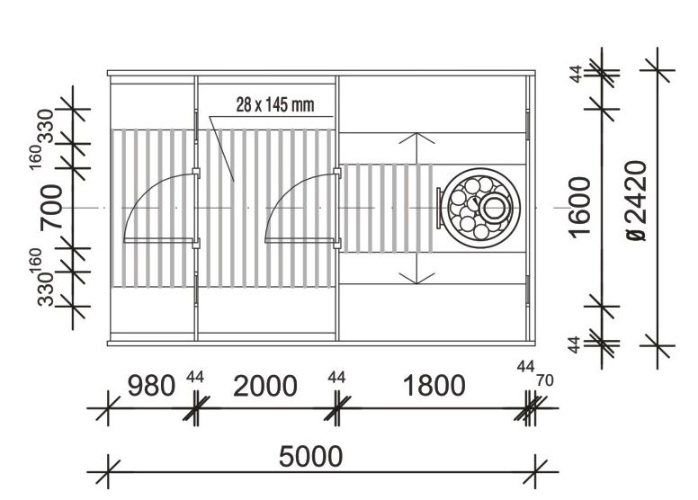 Tynnyrisauna 5MX2,4M DELUX Lämpökäsiteltykuusi