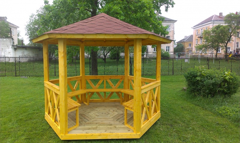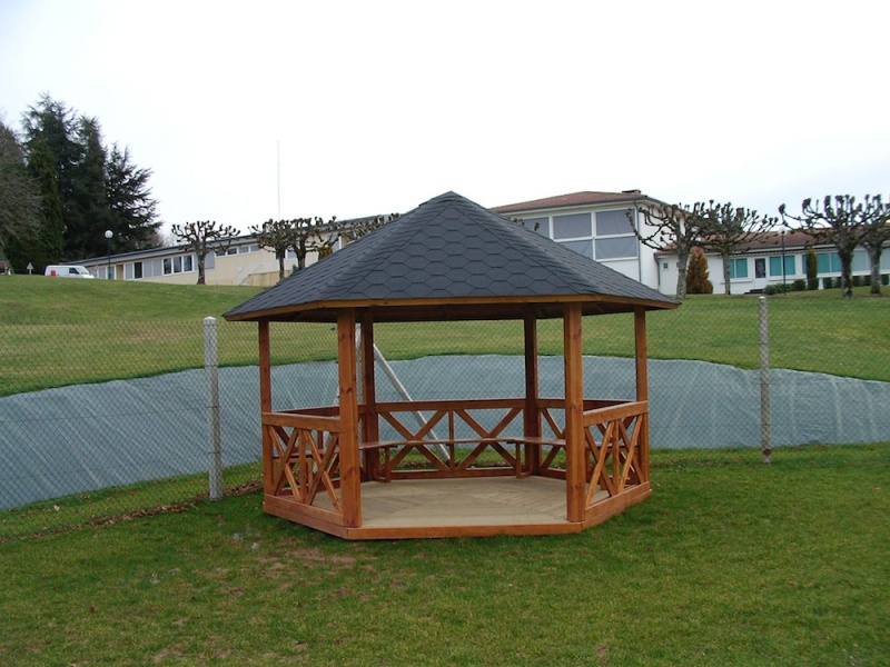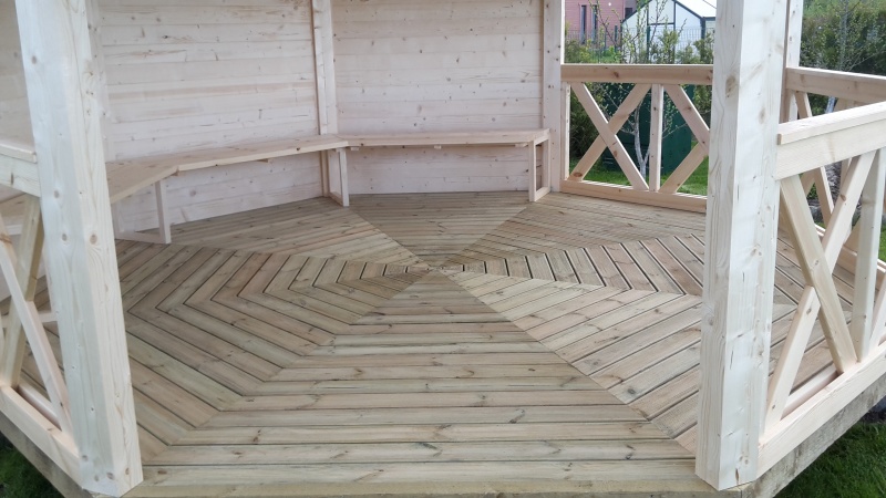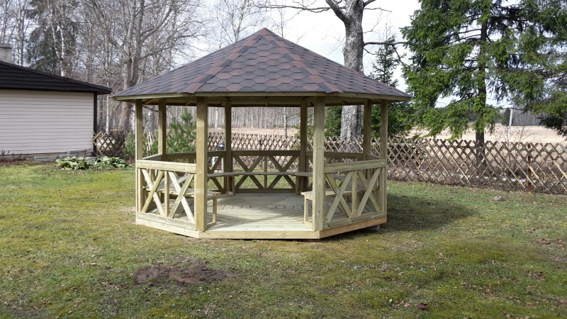 Grillikatos 9,5M2.Halkaisija 3,8M.Seinän paksuus 28mm,seinän korkeus 1,9M,seinä elmentin pituus 1,9M.Toimitussisältö.6kpl kyllästettyjä lattiaelementtejä,5klp seinäelementtejä,6kpl liimapuu tolppia,6kpl kannatin palkkeja,6kpl kattoelementtejä joissa palahuopa musta valmiiksi kiinitetty,räystäslaudat,kiinitystarvikkeet,asennuohjeet,