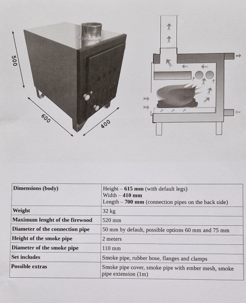 35kw Kamina toimitussisältö: mitat leveys 400mm,korkeus 500mm,syvyys 600mm.paino 32kg.2M Piippu (halkaisija 110mm)Liitoskappaleet tynnyriin 50mm 2kpl.Vaihoehtoisesti tilattaessa 60mm tai 75mm.Hinta 649€.