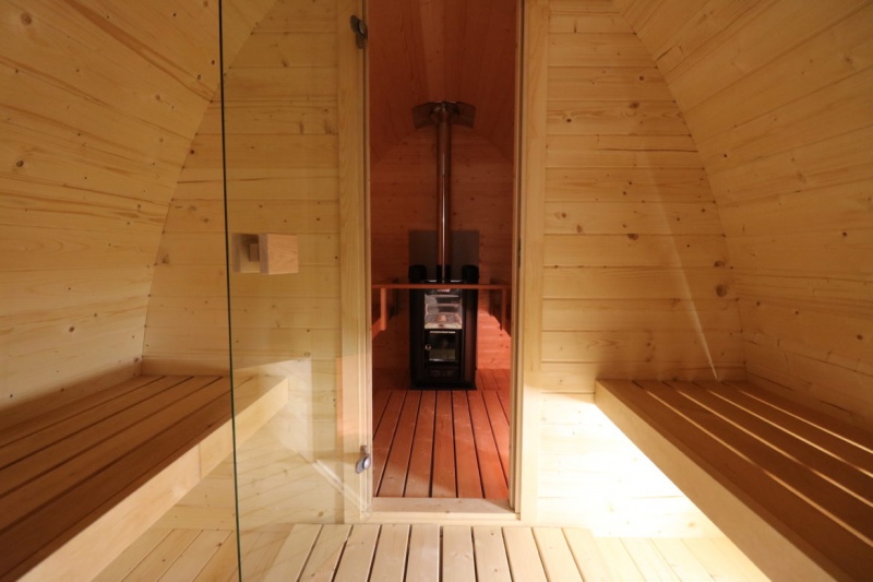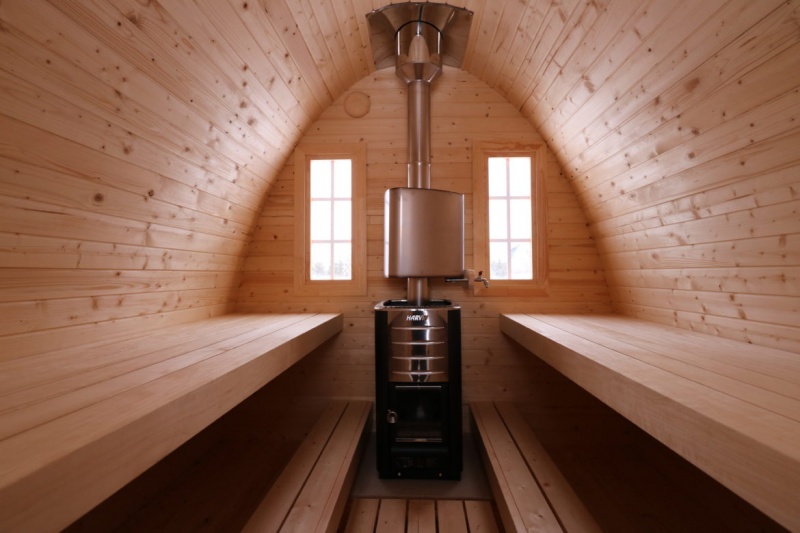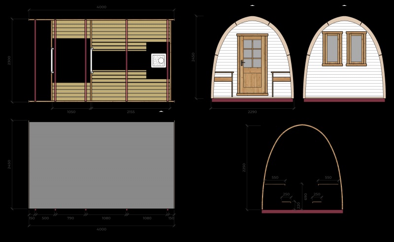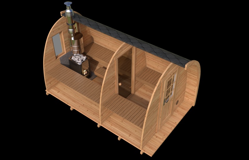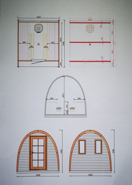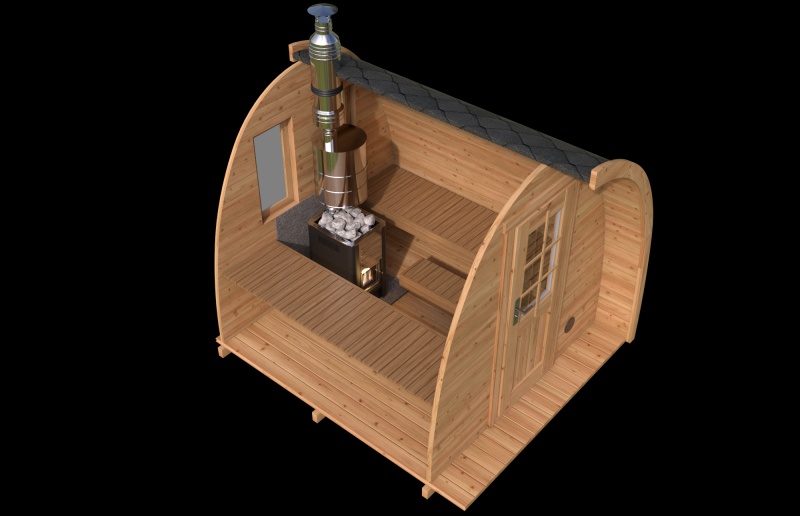 Asiakkaalle jää vain vesisäiliön ja piipun asennu.katossa on valmiina läpivienti reikä piipulle.Saunan lattiassa on reikä 50mm pesuvesien poistoa varten.