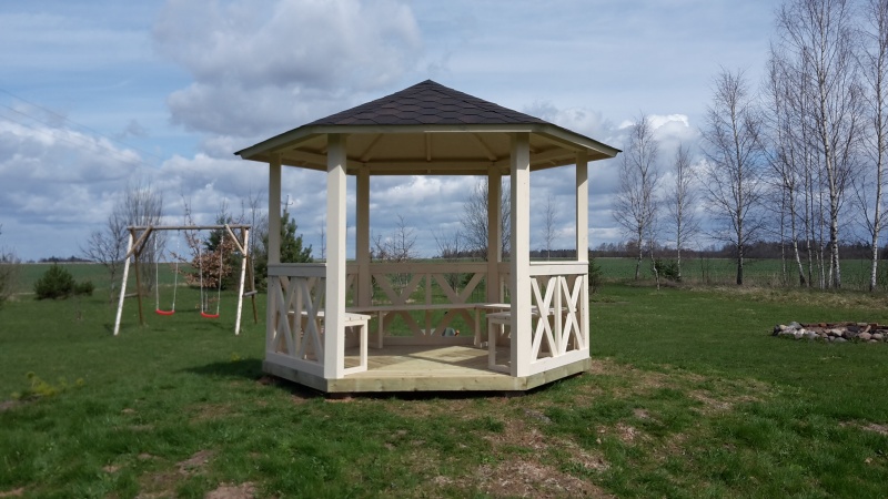 Grillikatos 9,5M2.Halkaisija 3,8M.Seinän paksuus 28mm,seinän korkeus 1,9M,seinä elmentin pituus 1,9M.Toimitussisältö.6kpl kyllästettyjä lattiaelementtejä,5klp seinäelementtejä,6kpl liimapuu tolppia,6kpl kannatin palkkeja,6kpl kattoelementtejä joissa palahuopa musta valmiiksi kiinitetty,räystäslaudat,kiinitystarvikkeet,asennuohjeet,