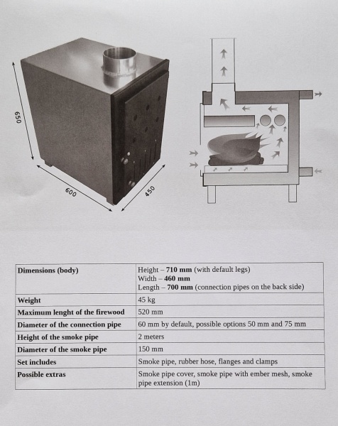 45kw Kamina toimitussisältö:mitat leveys 450mm,korkeus 650mm,syvyys 600mm.paino 45kg.2M piippu (halkaisija 150mm) Liitoskappaleet tynnyriin 60mm.Vaihtoehtoisesti tilattaessa 75mm.Hinta 849€.