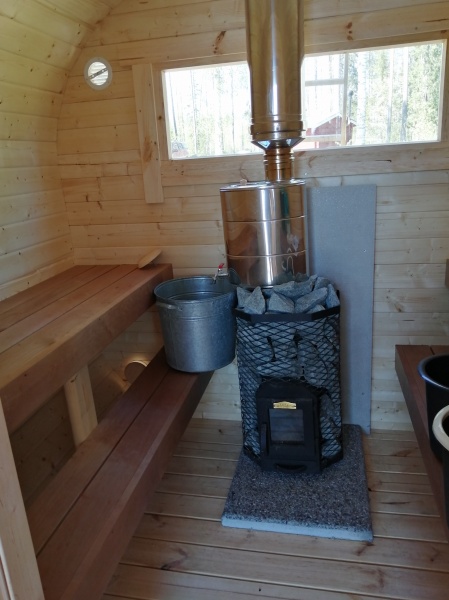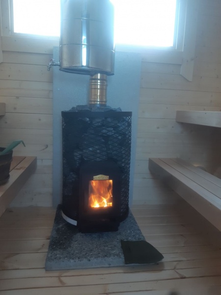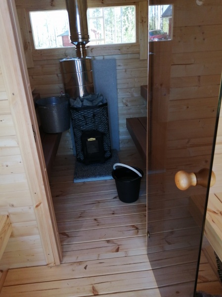 Sauna sisältää lasiluukullisen verkko kiukaan ja kiuvaskivet,ce merkityn lämpöeristetyn piipun,vesisäiliön rst,kiukaan alus laatan,suojalevyn kiukaan takana.irroitettavat lattiaritilät, lauteet 2 tasossa, ikkunat 3kpl ja lukollinen ulko ovi lasilla ja rst kynnyksellä,ilmastointiventtiilit. pukuhuoneen ovi lasilla,saunan lauteet käsitelty saunasuojalla ja ulkopuolelta puuöljyllä. Rst pannat 4kpl.Palahuopa musta.Saunan seinien paikkaa voi muuttaa halutessaan kysy se erikseen.