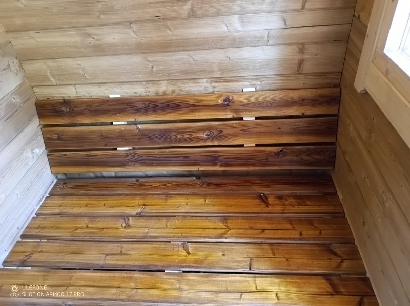 Sauna pukuhuone ja terassi.Pituus 400x240,sisä korkeus 218,materiaali lämpöpuu, kaikki seinät 42mm.