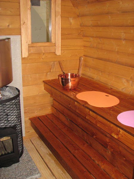 Sauna sisältää lasiluukullisen verkko kiukaan+kivet ja lämpöeristetyn piipun,vesisäiliön rst,kiukaan alus laatan,suojalevyn kiukaan takana,irroitettavat lattiaritilät,lauteet 2 tasossa leppä, ikkunat 4kpl ja lukollinen ulko ovi rst kynnyksellä,ilmastointiventtiilit. pukuhuoneen ovi lasia,saunan lauteet käsitelty saunasuojalla ja ulkopuolelta puuöljyllä. Rst pannat 4kpl.Palahuopakatto musta.