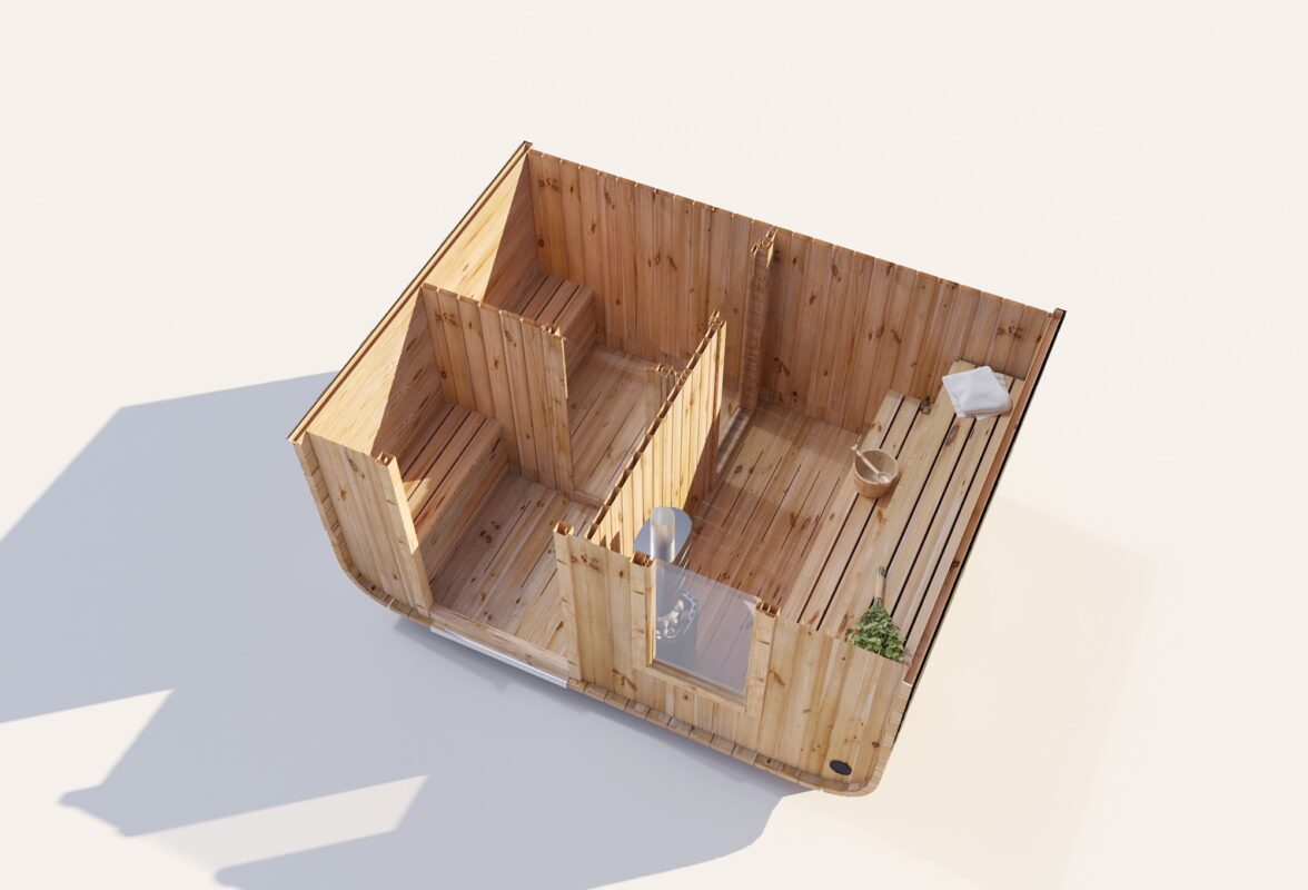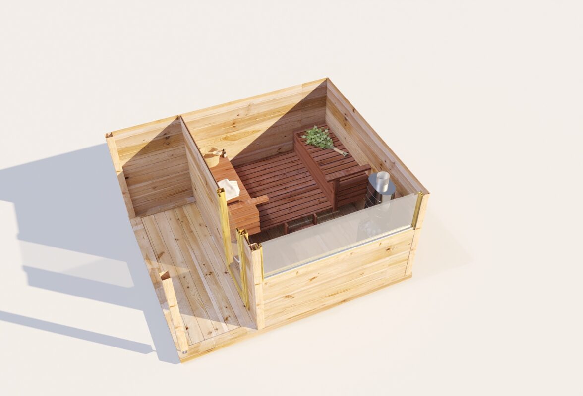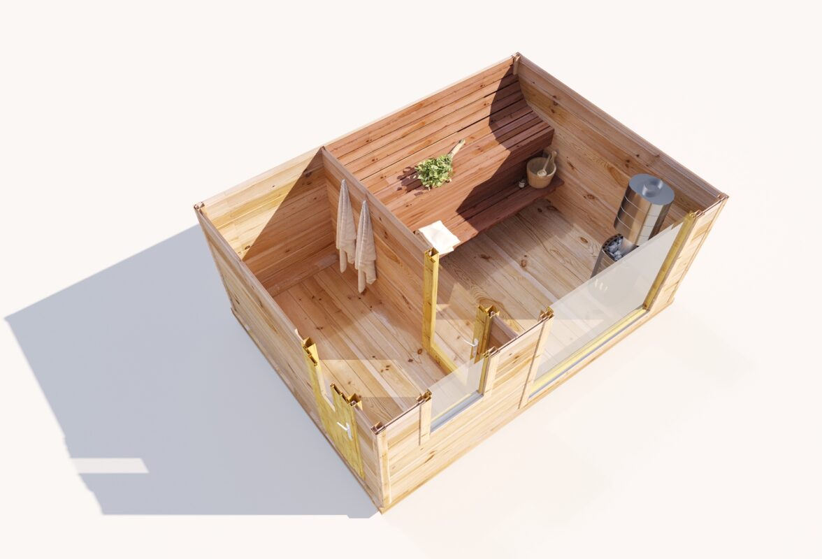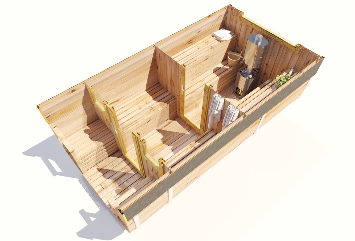 - Kaksiportaiset L-muotoiset lauteet lämpökäsiteltyä kuusta
