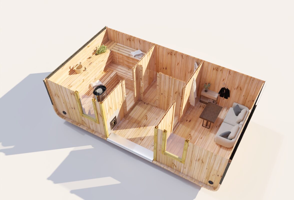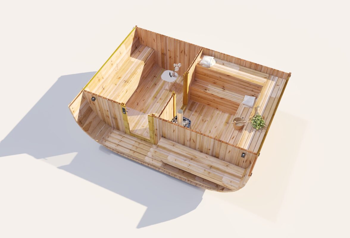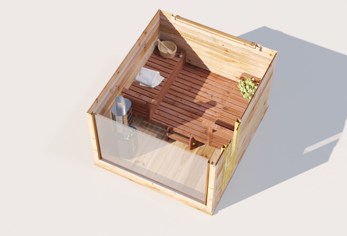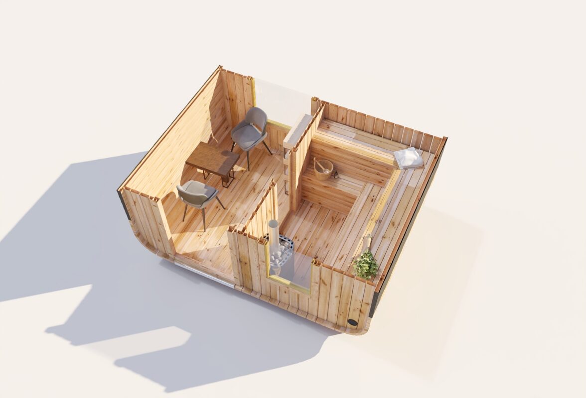 - Kaksiportaiset L-muotoiset lauteet lämpökäsiteltyä kuusta