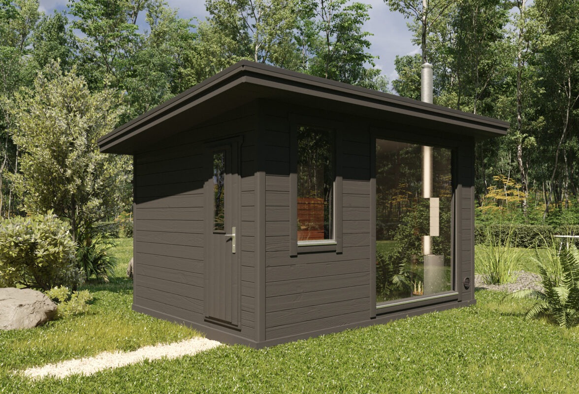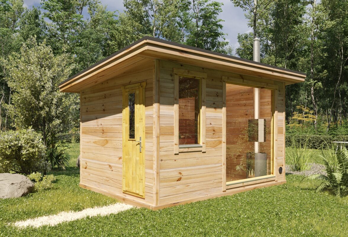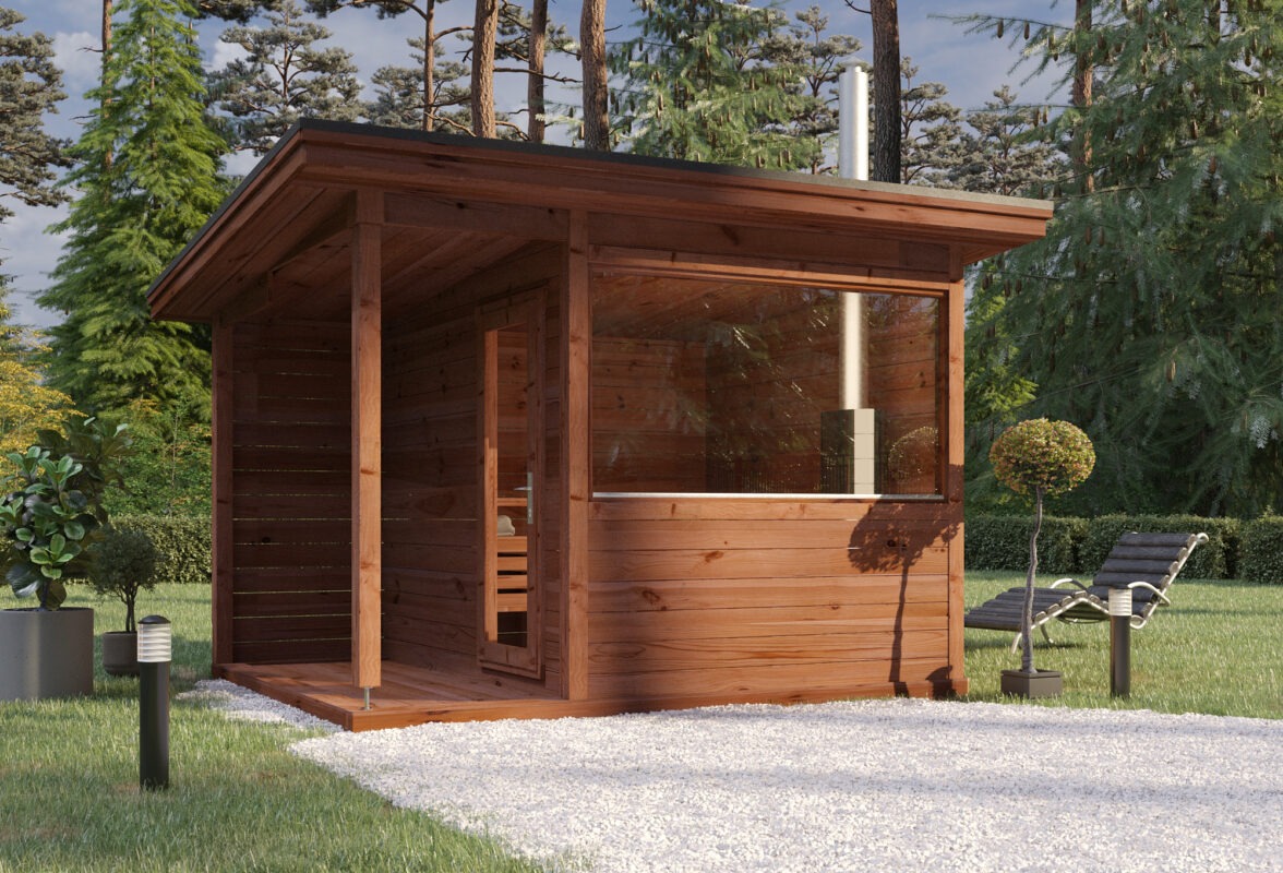 Löylyhuoneen mitat: 216 cm × 203,8 cm - Etusivussa lasielementti-ikkuna, koko 1600 × 500