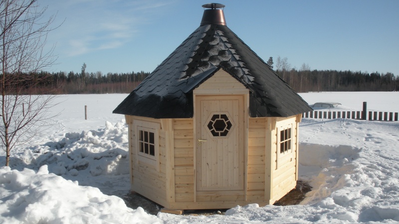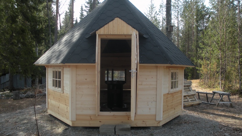 6-kulmainen kota ,valmistettu kuusesta,seinäelementit 44mm alapuu kyllästetty,katto elementit,paketti lasi ikkunat 3kpl jotka avattavat.lukollinen ovi.